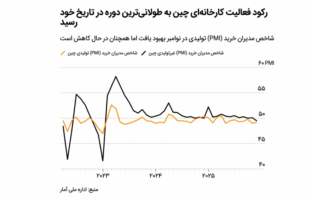 فعالیت کارخانههای چین در ماه نوامبر اندکی بهتر شد اما همچنان در وضعیت انقباض ماند و طولانیترین دوره کاهش ثبتشده را ادامه داد. شاخص رسمی مدیران خرید بخش تولید به ۴۹/۲ رسید و برای هشتمین ماه زیر مرز ۵۰ ماند. شاخص مدیران خرید بخشهای غیرتولیدی در ساختوساز و خدمات نیز با افت به ۴۹/۵ رسید که نخستین انقباض آن در نزدیک سه سال گذشته بود؛ نتیجه ضعف در بخش املاک و خدمات مرتبط با مسکن.